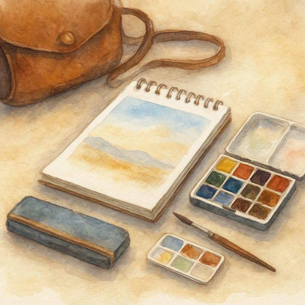 Before this trip, I spent more time packing my art supplies than my clothes. I wanted to bring just enough to feel grounded—but not so much that it became a burden. Over the years, I’ve come to think of this little kit as my portable studio: a few brushes, a compact watercolor set, two small journals (one for writing, one for painting), and a pencil case with my favorite tools.